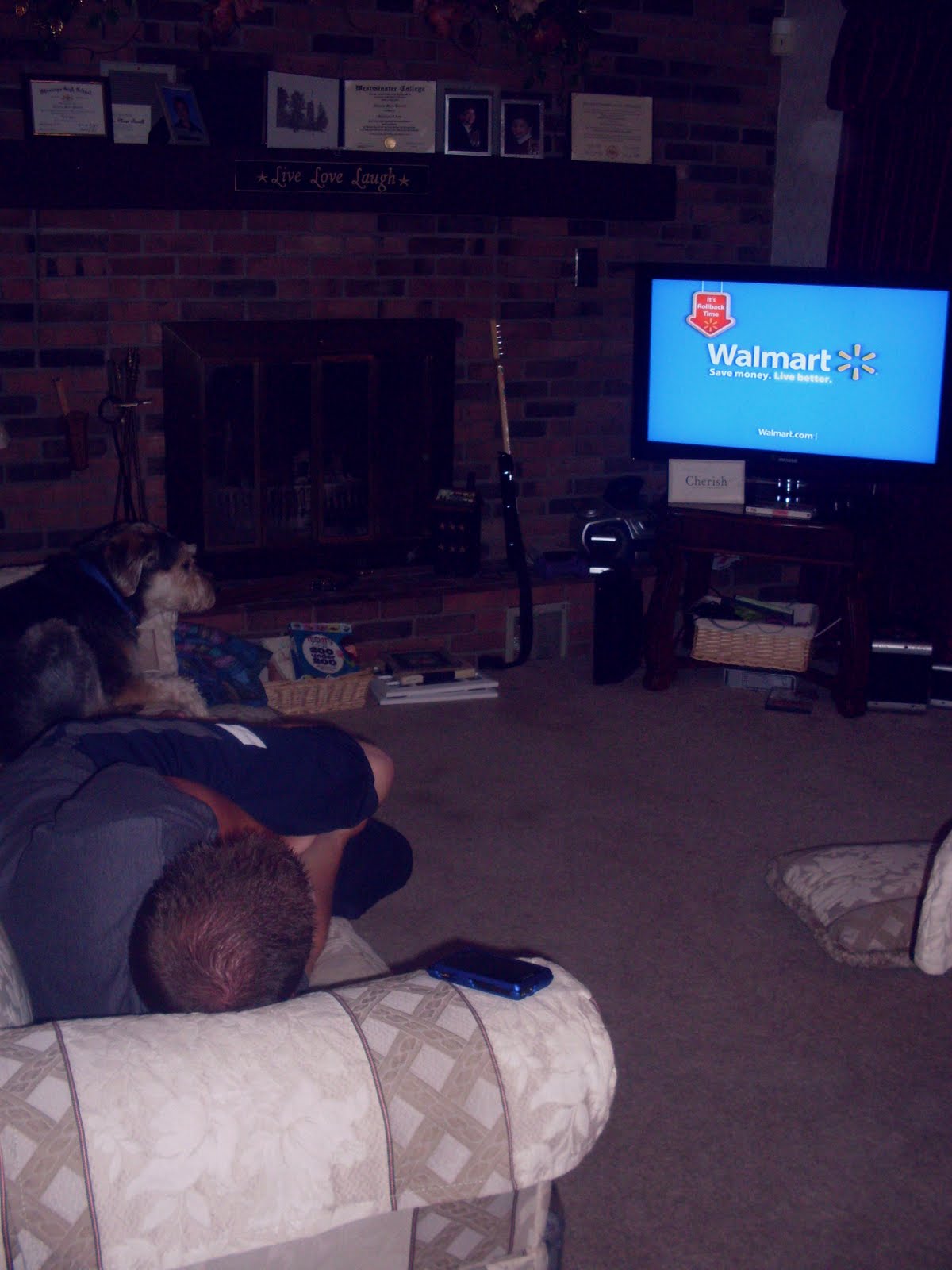 This is our living room within my father's house lol That's Brian & My baby Tony <3 Both who you'll see many more pictures of I'm sure. It shows a good glimpse of "us". My favorite saying, "Live Love Laugh" sign, Brian's guitar for guitar hero, my library books,my diploma from Westminster, picture frames that need pictures in them!! (haha) So there ya go! Day 1 down!